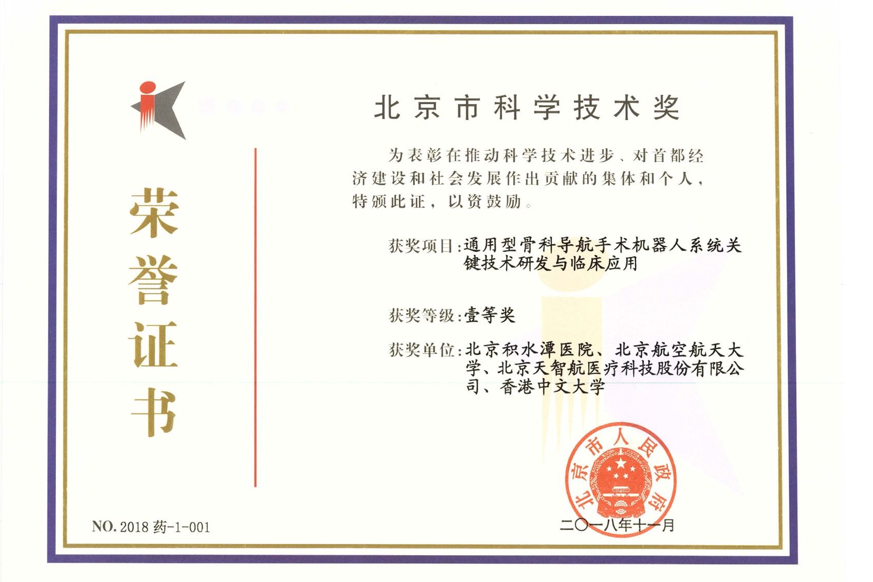 2018-榮譽證書-北京市科學技術一等獎