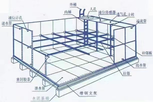 其次安裝各邦,根據(jù)水箱單板上的印號及說明,找出水箱邦體的各層邦號,并且預先分開,用螺栓組裝邦體。把水箱板立好,找正,使邦板與底邦形成90度夾角,并且加密封膠條,緊固螺栓。然后安裝內(nèi)拉筋,內(nèi)拉筋根據(jù)水箱尺寸,找對拉筋的數(shù)量及長度。用拉筋板測量拉筋對絲緊固部位,畫印、打眼、上對絲緊固,使拉筋平整的與水箱箱體保持平衡。如箱體與拉筋之間有較大誤差,可通過調(diào)整螺栓緊固程度來調(diào)整誤差大小,直到把誤差調(diào)整到合適為止。